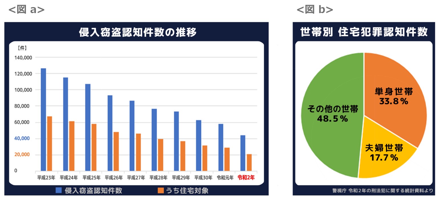 <図a>の通り、年々侵入窃盗の件数は減少傾向にあるものの、去年はなんと年間4万件以上、このうち住宅対象侵入窃盗は2万件以上も発生しているんだ!